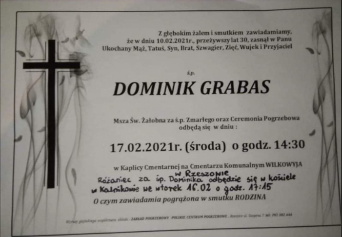 Ś.P. Dominik zmarł 10 lutego 2021r. w wypadku samochodowym. Do tragedii doszło na drodze wojewódzkiej nr 835 na wysokości Brzózy Królewskiej. Z relacji świadków wynika, że kierujący mazdą 40-latek wyprzedzał inne pojazdy i zderzył się z nadjeżdżającym z przeciwka dodge'em, w którym Pan Dominik podróżował jako pasażer. Odszedł niespodziewanie zostawiając kochającą żonę i ośmiomiesięczną córeczkę.